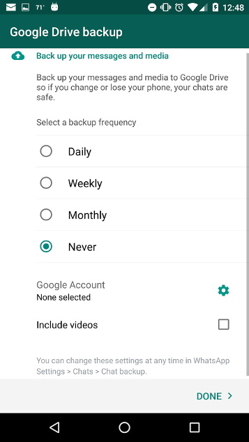 Another setting the security-conscious should watch out for is that they aren't storing unencrypted backups to the cloud. In Android, WhatsApp gives the option to send these backups to Google Drive; for iOS the option is to send it to iCloud. Navigate to Settings → Chats → Chat backup to ensure cloud backups are turned off: