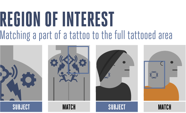 Region of Interest: NIST uses “Region of Interest” to describe how well an algorithm can match a small piece of a tattoo to a wider image of the whole tattoo. For example, could the algorithm recognize that a tiny skull tattoo is part of a larger half-sleeve arm tattoo.