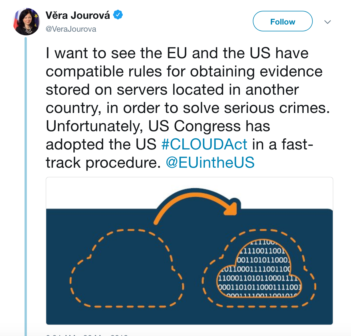 Indeed, Commissioner Jourova has already decried deficiencies in the United States’ approach, stating on Twitter that she wants to see “the EU and the U.S. have compatible rules for obtaining evidence stored on servers located in another country, in order to solve serious crimes. Unfortunately, the U.S. Congress has adopted the CLOUD Act in a fast-track procedure.”