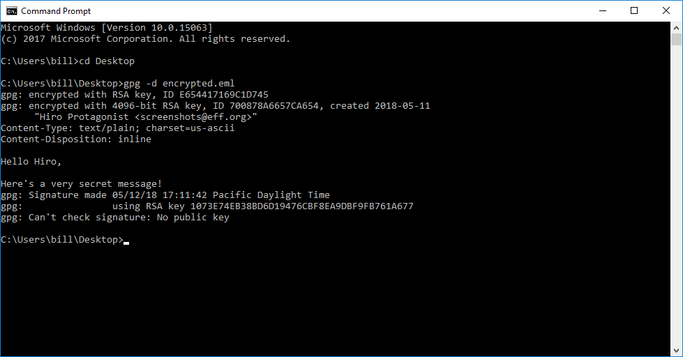 5. Type the following text exactly: “gpg -d encrypted.eml”, then hit the “Enter” key. Outlook users should type exactly “gpg -d encrypted.asc” instead.