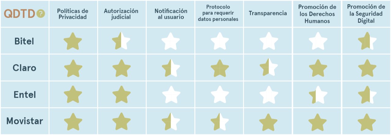 Quien Defiende Tus Datos is part of a series across Latin America and Spain carried out in collaboration with EFF and inspired in our Who Has Your Back? Project. This year’s edition evaluates the four largest Internet Service Providers (ISPs) in Peru: Telefónica-Movistar, Claro, Entel, and Bitel.