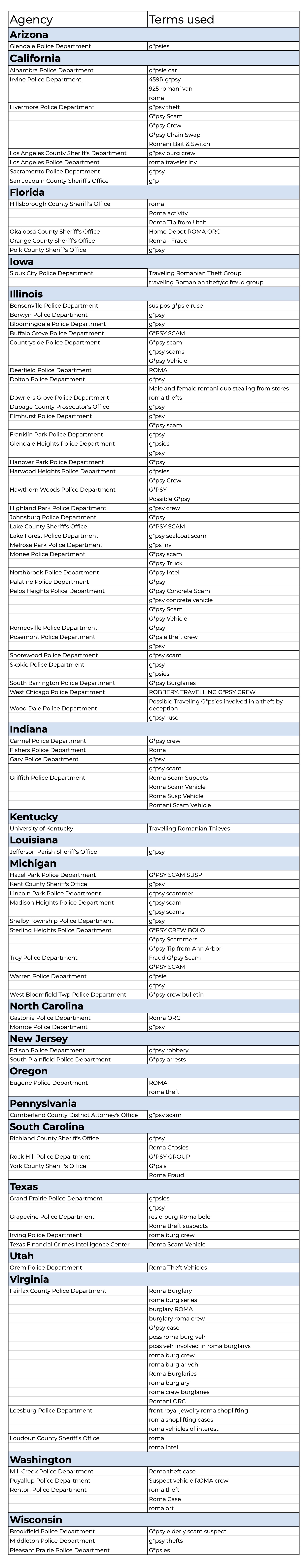 En los últimos años, los departamentos de policía han creado grupos de trabajo especializados en «delitos gitanos», han nombrado detectives especializados en «delitos gitanos» y han organizado cursos de formación policial sobre «criminalidad gitana». La Asociación Nacional de Investigadores Bunco (NABI), una organización de profesionales de las fuerzas del orden que se centra en el «crimen organizado no tradicional», ha creado incluso una base de datos de personas detenidas o sospechosas de actividades delictivas, en la que se marca claramente a las que son romaníes.