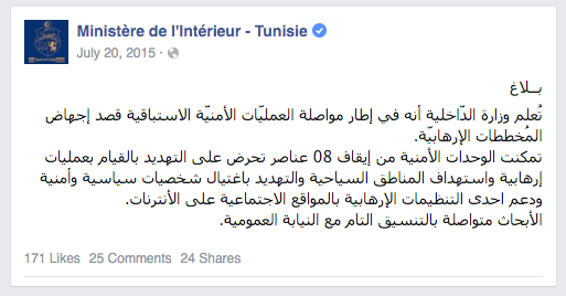 “Announcement: The Ministry of Interior has managed to arrest 8 individuals that are inciting the following activities: carrying out terrorist attacks targeting touristic areas, the assassination of security and political figures, and supporting a terrorist organization via social media on the Internet. In collaboration with the public prosecutor, the investigation continues.”